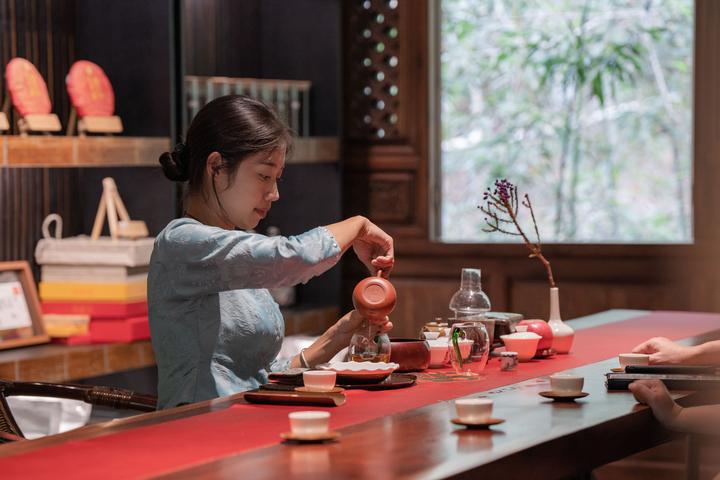 在景迈山布朗公主茶厂,布朗族姑娘叶香在给顾客泡茶。新华社记者 胡超 摄