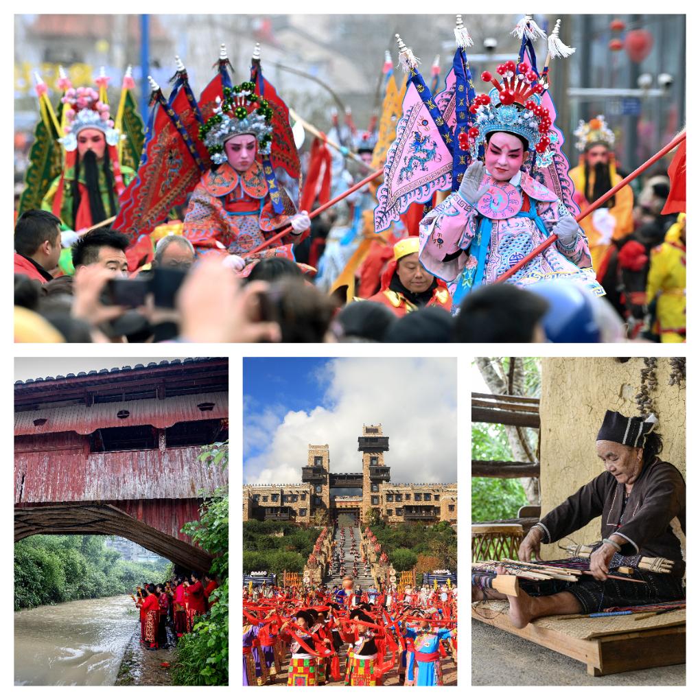 图片分别为春节期间民俗活动(上,新华社记者邹竞一摄)、浙江庆元县的木拱桥(下左,吴春平摄)、四川阿坝羌年庆祝活动(下中)、黎族织锦技艺(下右,新华社记者蒲晓旭摄)。中华文化灿若星河