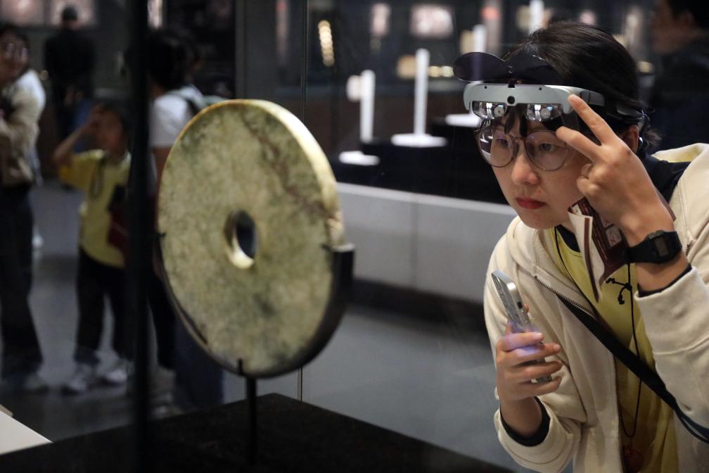 游人在位于浙江省杭州市余杭区的良渚博物院观赏展品(2024年10月5日摄)。新华社发(徐军勇 摄)