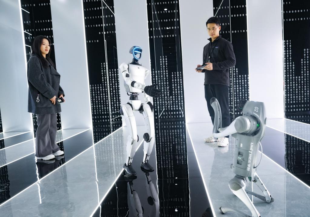 2025年3月1日,在杭州宇树科技有限公司的产品展示中心,人形机器人和四足机器人在工作人员控制下做动作。新华社记者 翁忻旸 摄