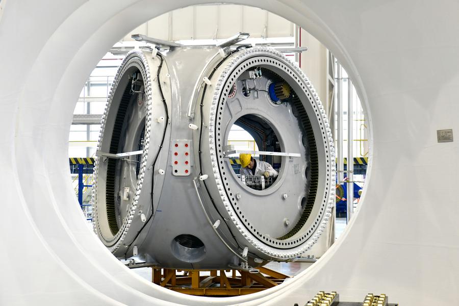 2025年2月22日,在三一重能(日照)风电设备制造有限公司,工作人员在风电设备生产车间忙碌。新华社记者 郭绪雷 摄