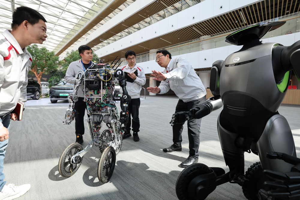 2025年2月24日,广汽集团董事长冯兴亚(右一)在广州向广汽第三代具身智能人形机器人团队工程师了解该型机器人的AI自主控制技术突破和应用场景创新情况。新华社记者 刘大伟 摄