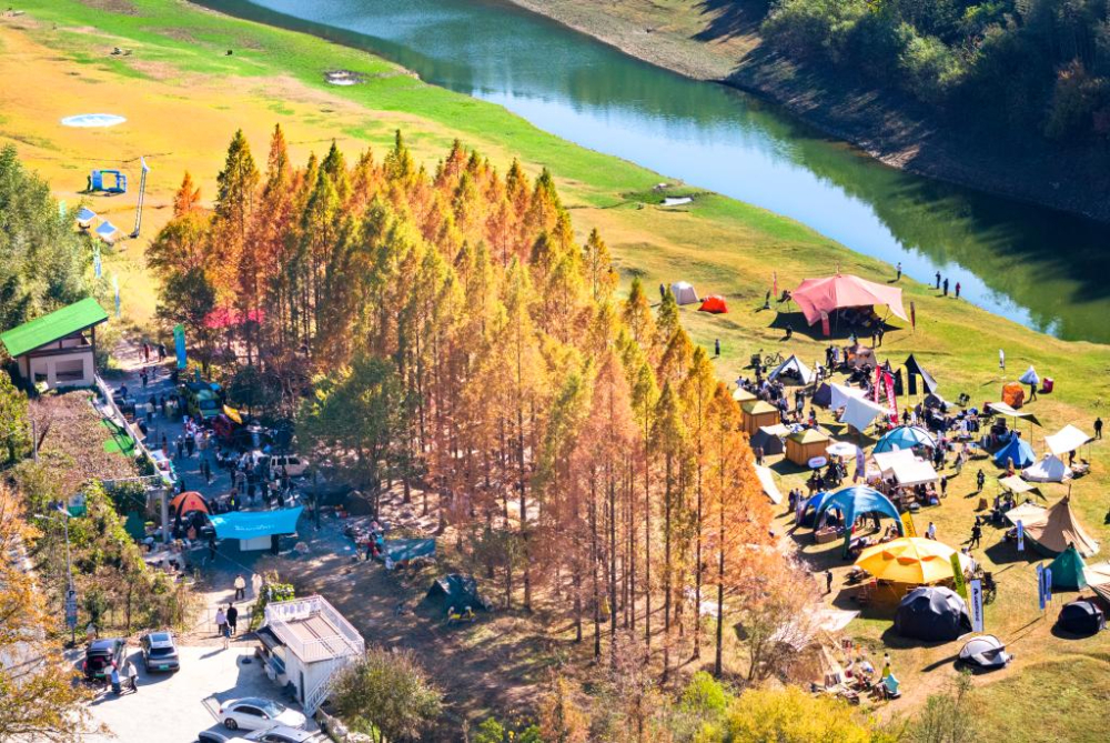 游客在浙江安吉夏阳村的露营地里休闲游玩(2024年11月30日摄,无人机照片)。新华社发(潘学康 摄)