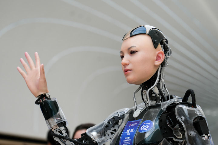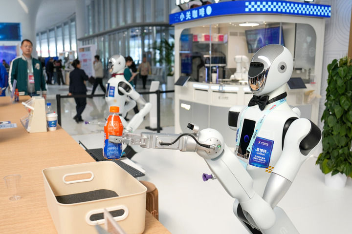 在中关村国际创新中心,一款名为“小关”的人形机器人向与会嘉宾招手(3月27日摄)。新华社记者 鞠焕宗 摄