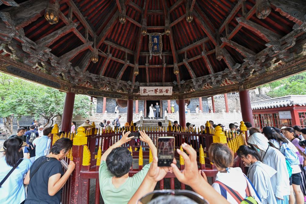 游客在晋祠博物馆的难老泉参观拍照(2024年7月25日摄)。新华社记者 杨晨光 摄