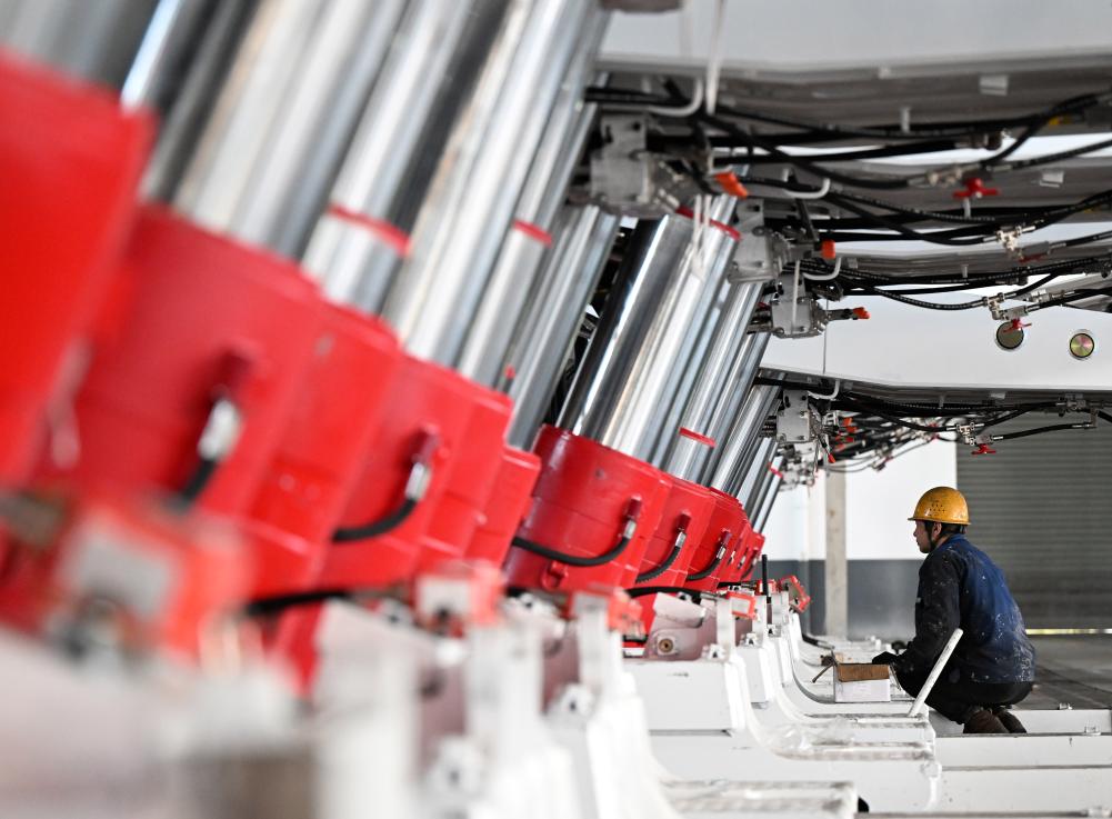 工人在林州重机集团股份有限公司液压支架总装车间进行安装调试作业(2025年3月19日摄)。新华社记者 李嘉南 摄
