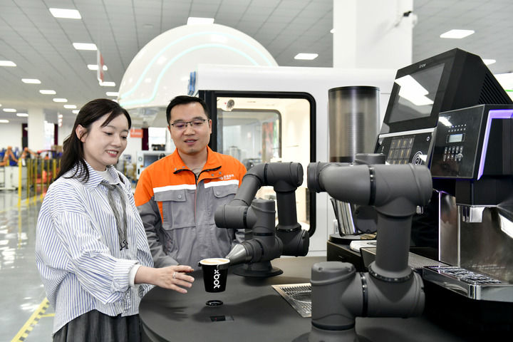 2025年4月1日,在遨博(山东)智能机器人有限公司,咖啡机器人在为参观者制作咖啡。新华社记者 郭绪雷 摄