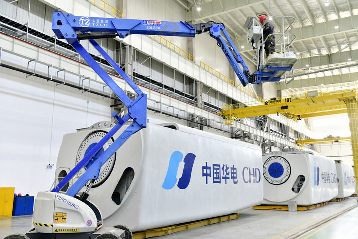 2025年4月2日,在位于山东省胶州市九龙街道的上海电气上合风电装备产业园,工作人员在组装风电机。新华社记者 郭绪雷 摄