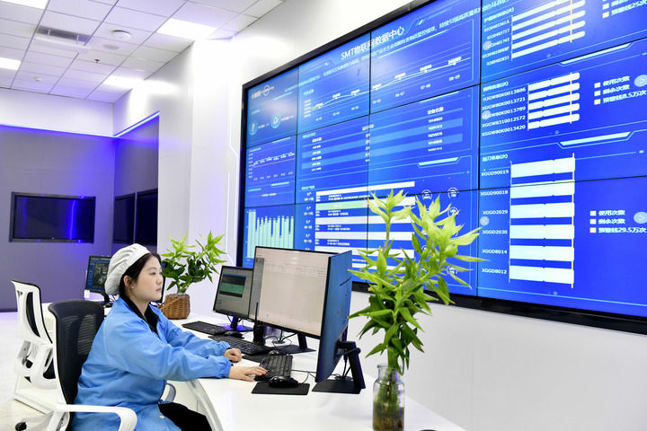 2025年4月3日,在青岛领智电子科技有限公司,工作人员在SMT物联网数据中心值守。该公司是全球最大的家电控制板供应商之一,其数字化生产系统由海尔卡奥斯工业互联网平台搭建。新华社记者 郭绪雷 摄