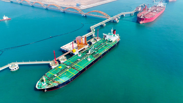 在山东港口日照港岚山港区30万吨级油品码头,船舶停靠进行卸油作业(2024年3月29日摄,无人机照片)。新华社记者 郭绪雷 摄