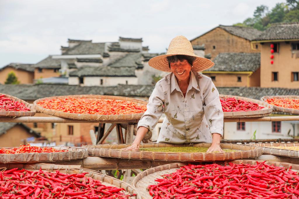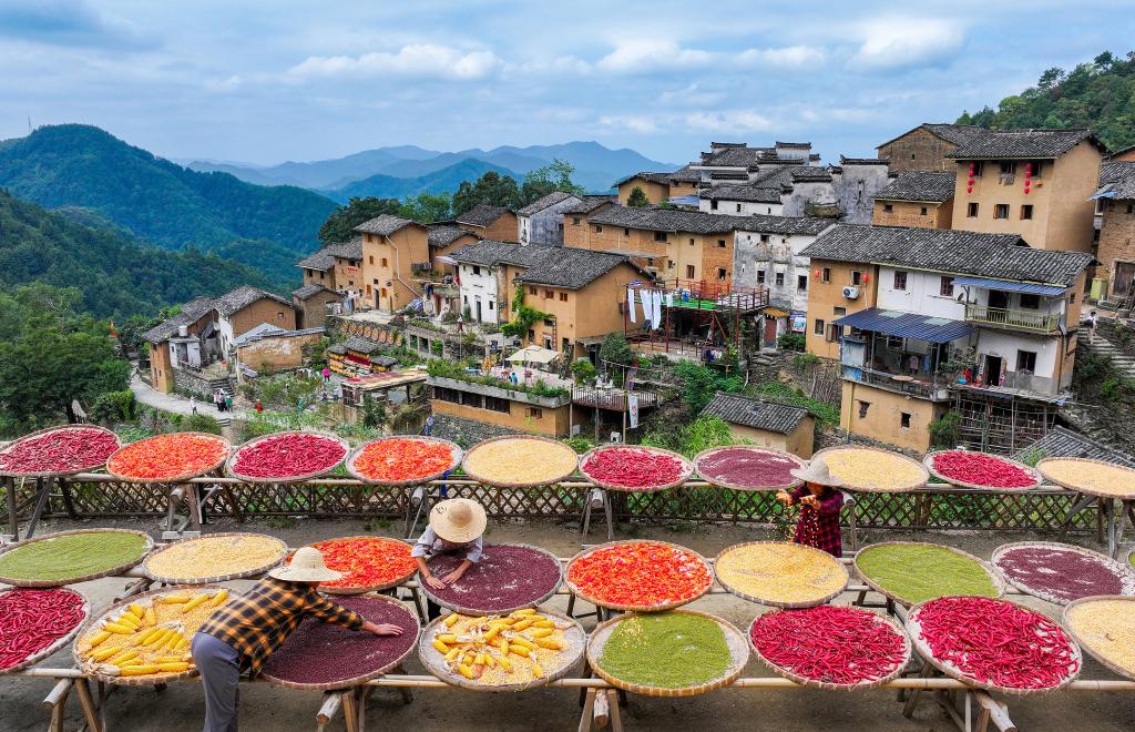 2024年9月22日,安徽省黄山市歙县阳产村村民在晾晒收获的农作物。新华社发(施亚磊 摄)