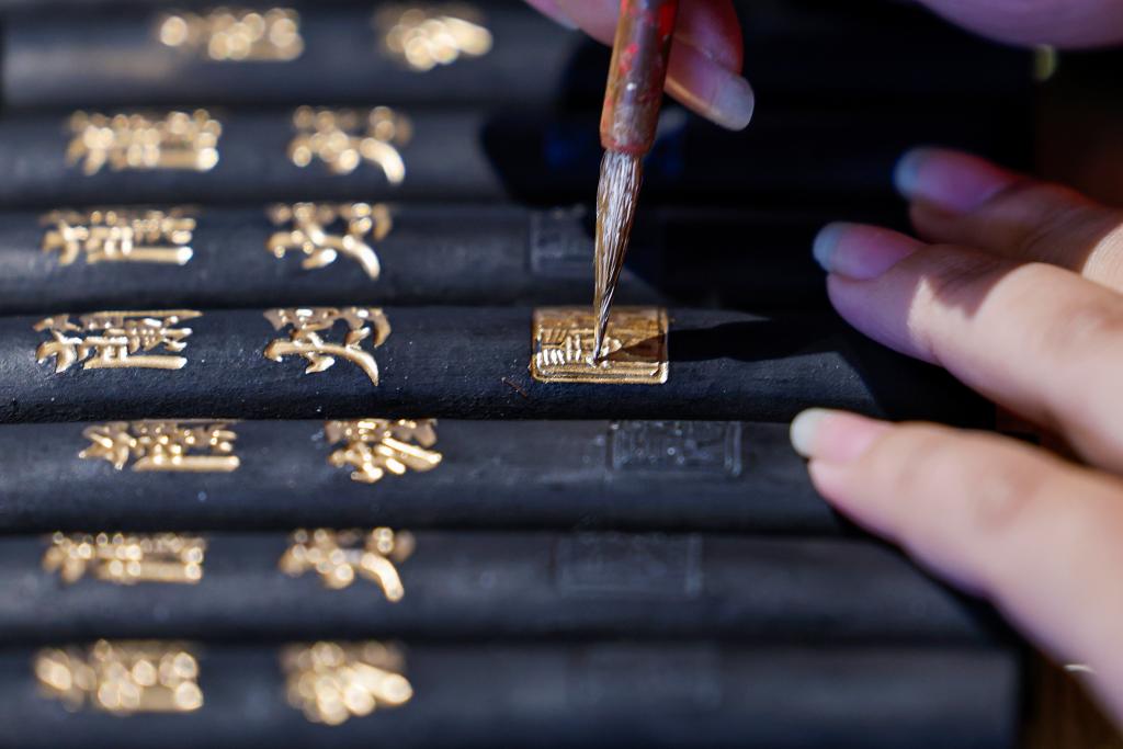 2024年11月27日,学生在安徽省行知学校徽墨实训课上为徽墨描金。新华社发(施亚磊摄)