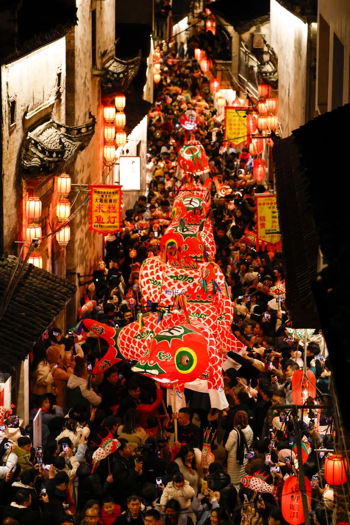 2024年12月31日,在安徽省黄山市歙县北岸镇瞻淇村,村民舞动非遗鱼灯,吸引了众多游客。新华社发(施亚磊 摄)