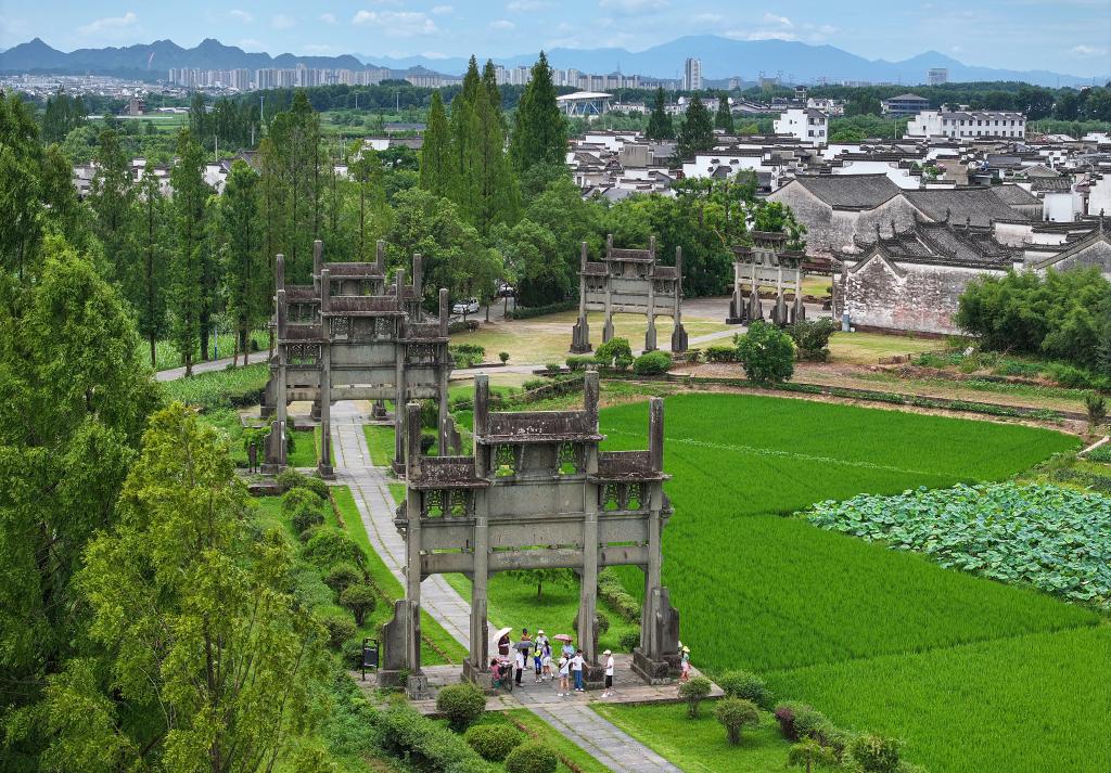 这是黄山市歙县棠樾牌坊群(2024年7月20日摄,无人机照片)。新华社发(施亚磊 摄)