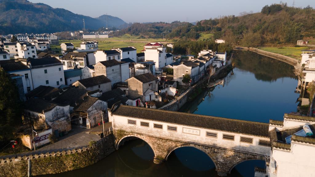 这是2025年3月24日在安徽省黄山市歙县拍摄的北岸廊桥和周边风景(无人机照片,画面下方为北岸廊桥)。新华社记者 张端 摄
