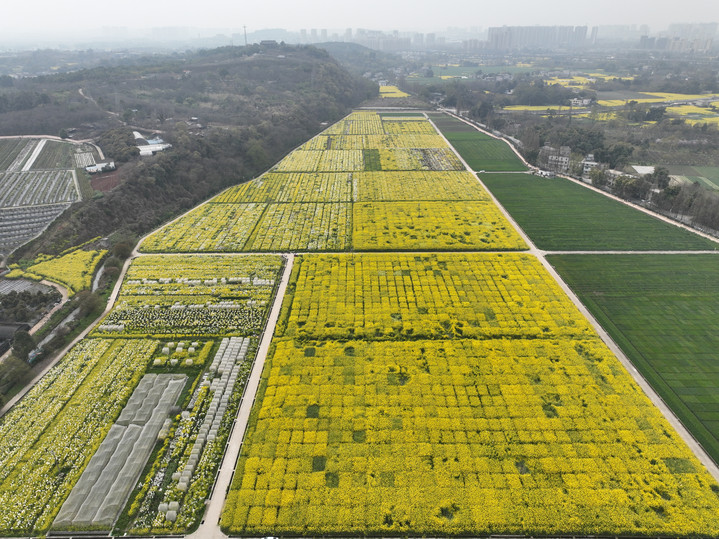 俯瞰油菜花期的四川省农业科学院现代农业科技创新示范园(无人机照片)。新华社记者 杨进 摄