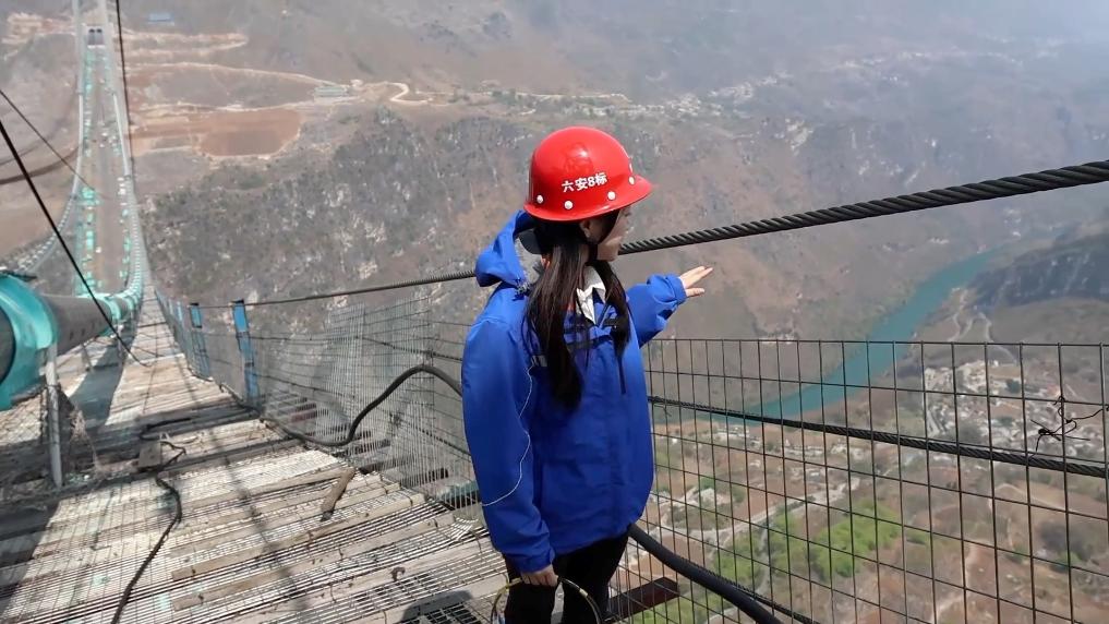 王玉娟是一名“95后”,负责花江峡谷大桥的影像记录。她经常要登上距离江面近800米的猫道顶端,用镜头记录工人们的建设过程。从最初的恐高到如今的从容,王玉娟正在见证花江峡谷大桥的“成长”历程。