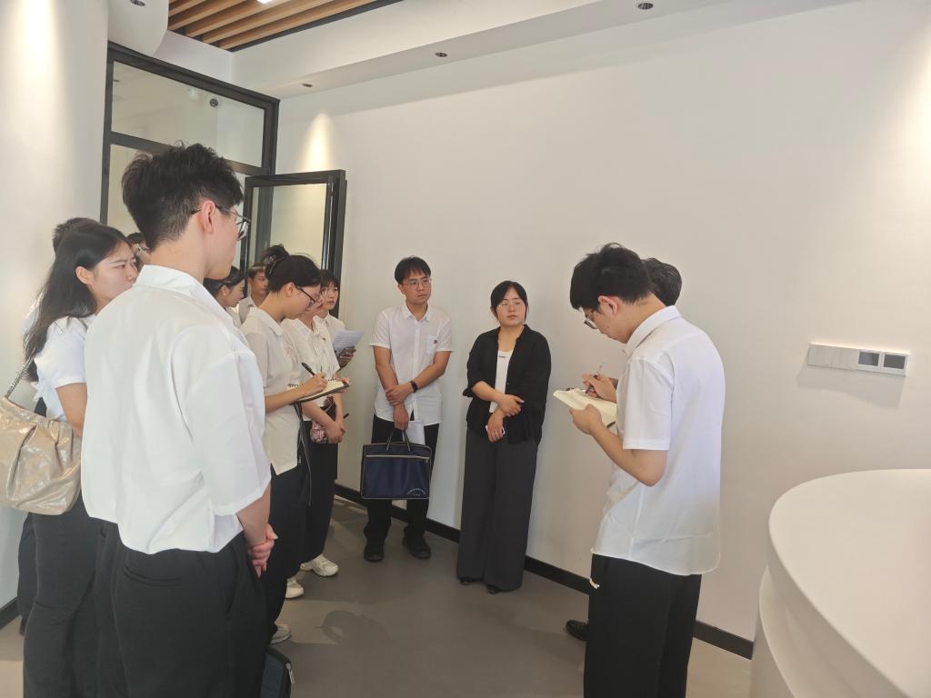 6月7日,唐文韬(右一)与郴州各地选调生在郴州市万华生态新家装(湖南)智能制造产业园调研。 新华社发