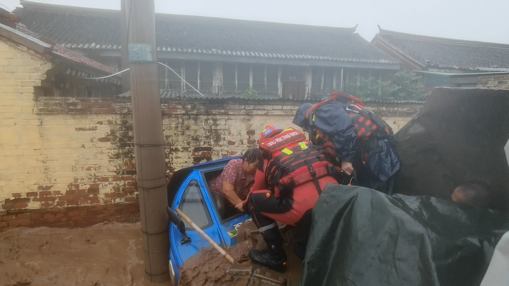 7月28日,消防救援人员在葡萄园村路口营救一名被困在三轮车里的群众。(密云消防供图)