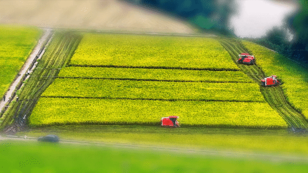 移轴镜头下看水稻收割