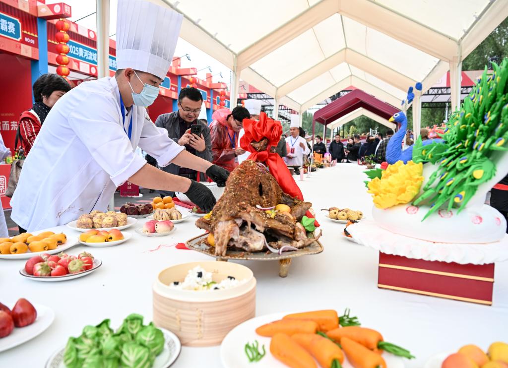 10月1日,在宁夏吴忠市利通区牛家坊民俗文化村举行的第五届吴忠早茶美食文化节厨艺争霸赛上,厨师为游客展示、介绍特色美食。新华社记者 冯开华 摄