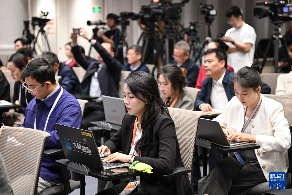 10月14日,国务院新闻办公室在北京举行“高质量完成‘十四五’规划”系列主题新闻发布会,国家发展改革委党组成员、国家粮食和物资储备局局长刘焕鑫,国家粮食和物资储备局副局长钱毅、副局长秦玉云介绍“十四五”时期粮食流通改革发展成效,并答记者问。这是记者在现场工作。新华社记者 陈晔华 摄
