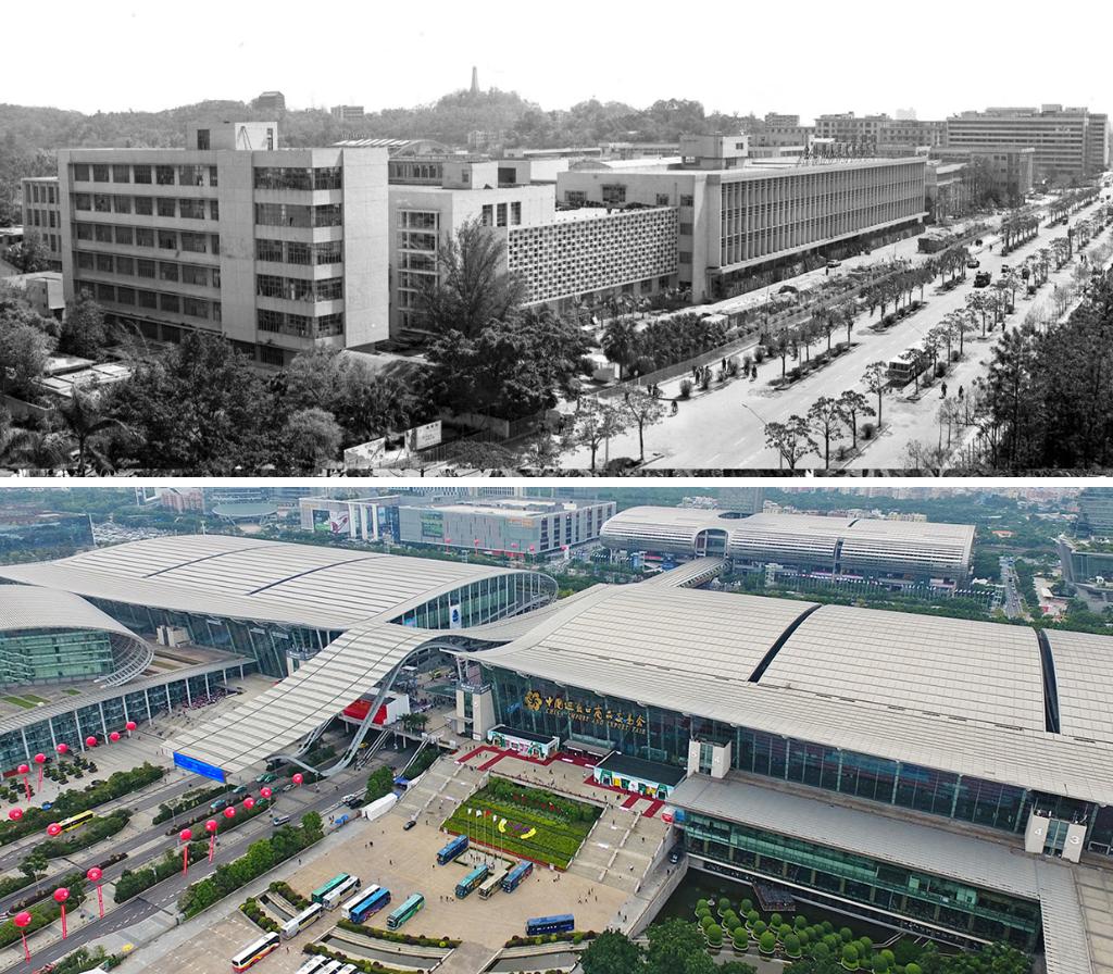 拼版照片,上图为:中国出口商品交易会原会址:流花湖畔的广州对外贸易中心。(新华社记者黄鉴秋摄,1980年4月4日发);下图为:2018年11月1日,无人机拍摄的第124届广交会现场。从2003年起,广交会逐步迁往新址——广州琶洲会展中心。(新华社记者梁旭摄)