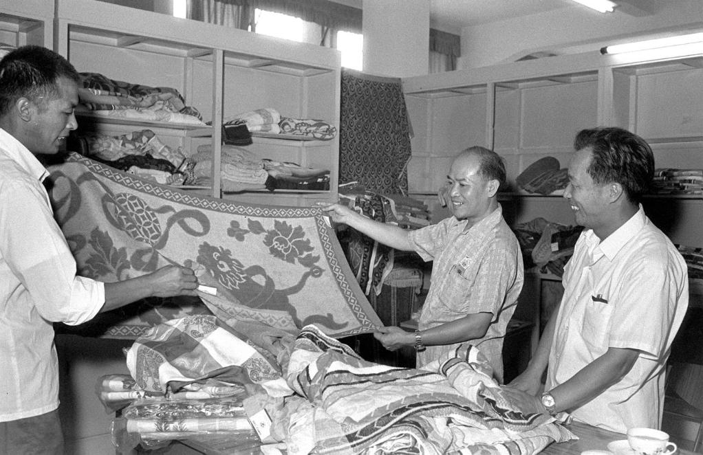 1977年秋季中国出口商品交易会10月15日在广州开幕。港澳客商在选购河南生产的狮子戏绣球浴巾。