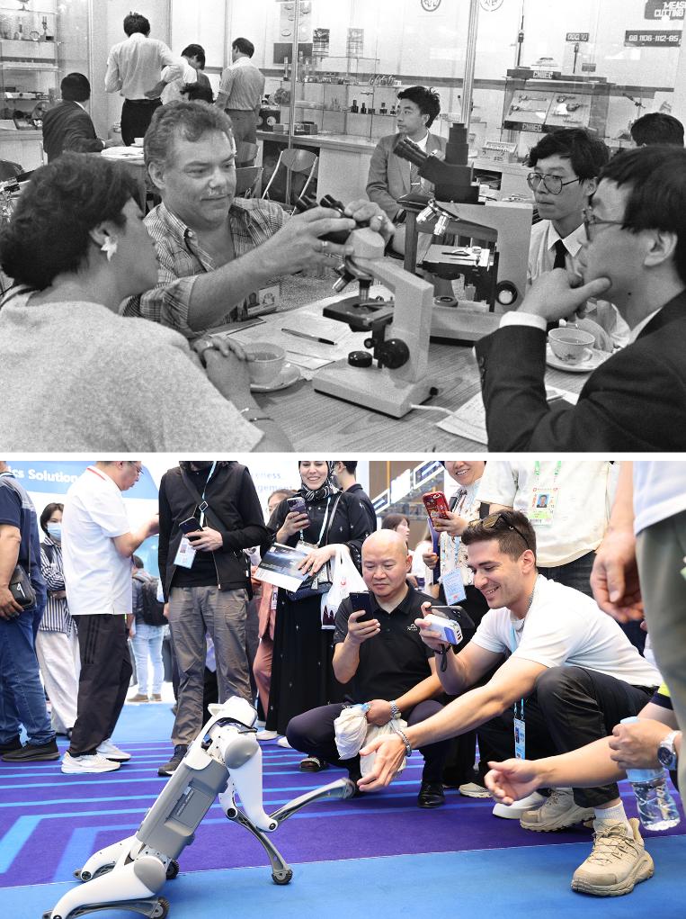 拼版照片,上图为:1990年10月15日,第68届中国出口商品交易会在广州开幕。中国仪器进出口总公司的产品大都是中国自行研制生产,其技术水平均居国内领先地位,其中一些产品还达到甚至超过了国际先进水平。这是美国客商在选购显微镜(新华社记者黄鉴秋摄);下图为:2025年4月15日在第137届广交会服务机器人专区,客商跟机器人互动。4月15日至19日举行的广交会第一期以“先进制造”为主题,首次增设服务机器人专区。(新华社记者卢汉欣摄)