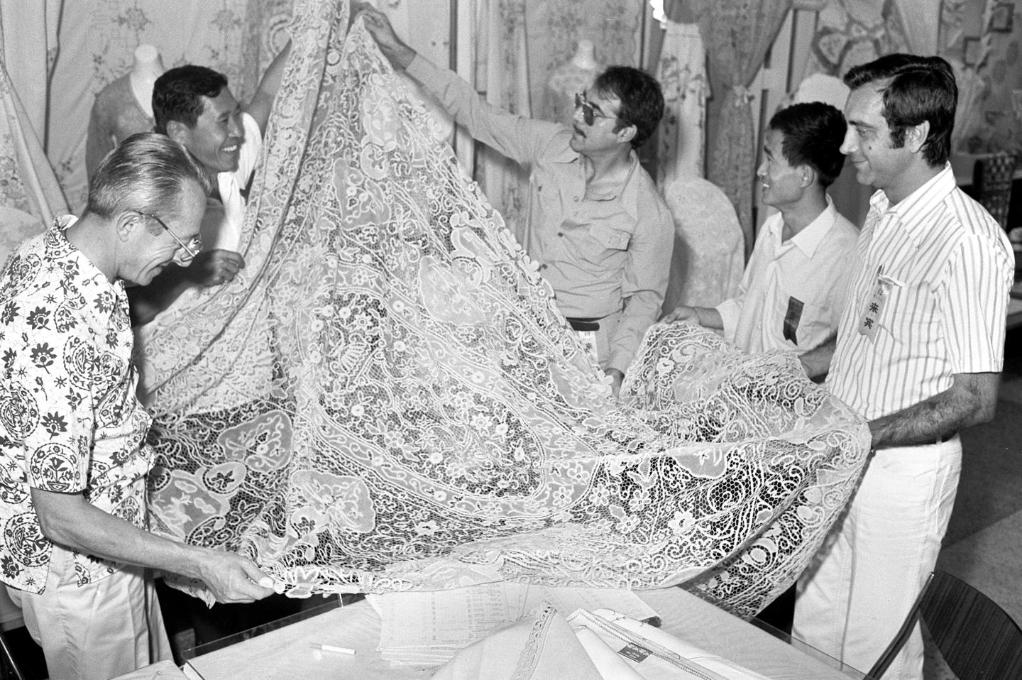 1977年秋季中国出口商品交易会上,西班牙客商选购山东烟台地区出产的抽纱。抽纱是烟台地区的传统手工艺品,花色繁多,质量精美,畅销世界各地。