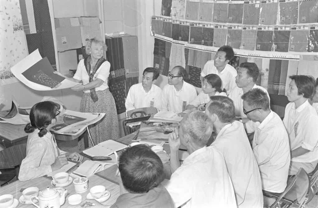 在1978年秋季中国出口商品交易会上,我纺织品交易团工作人员请西德客商介绍西德丝绸花色样品,以便使出口商品产销对路。