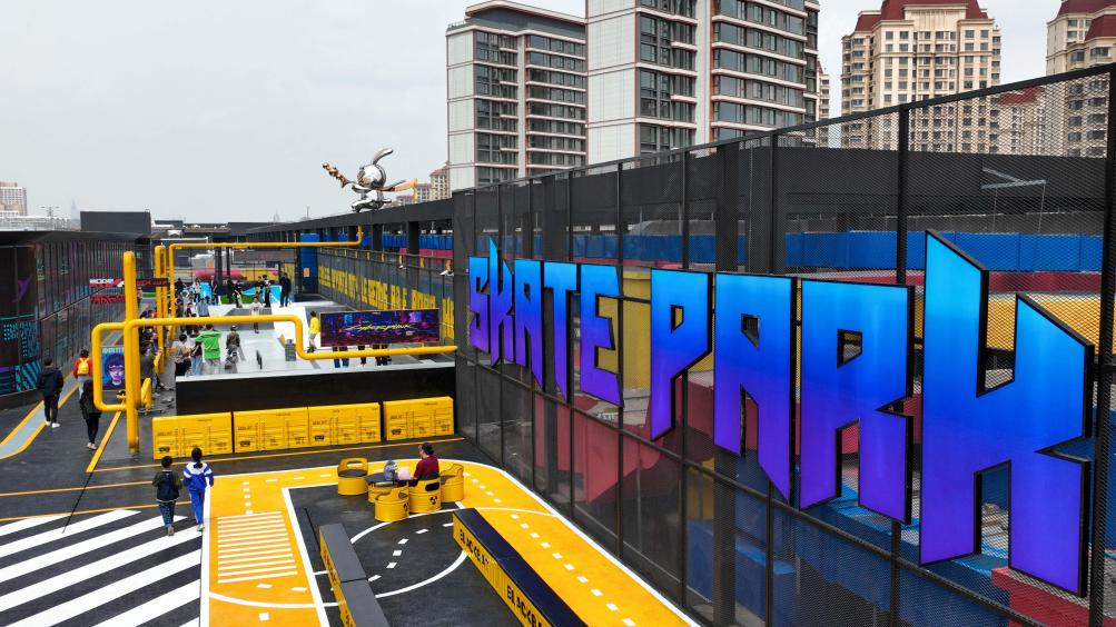 这是2023年4月28日拍摄的天津中海环宇城购物中心楼顶滑板公园(无人机照片)。新华社记者 孙凡越 摄
