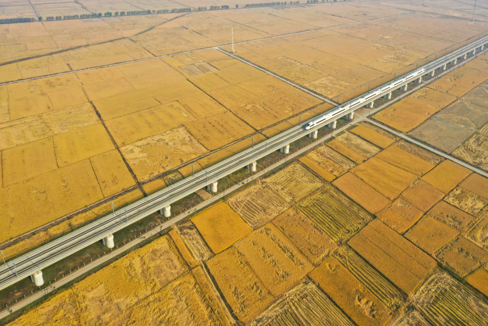 10月14日,在吉林省公主岭市,一列高铁列车沿着田间的铁路线穿行(无人机照片)。2025年,吉林省深化农机研发、制造、推广、应用一体化试点示范,农作物耕种收综合机械化率达94.6%。新华社记者 张楠 摄