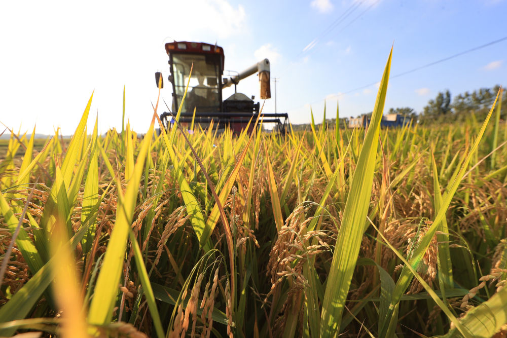 10月16日,在江苏省连云港市赣榆区城头镇中青墩村,种植户驾驶收割机抢收水稻。新华社发(司伟 摄)