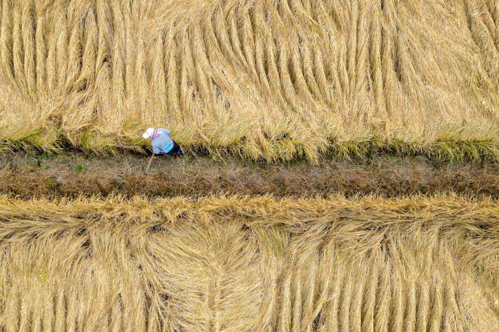 10月14日,在黑龙江省牡丹江市西安区沙虎村,村民在水稻田里忙碌(无人机照片)。新华社记者 张涛 摄