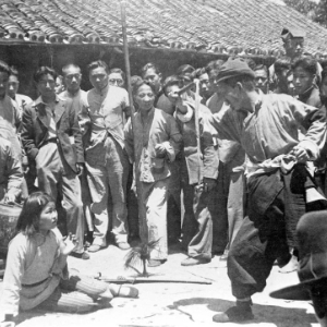 在国民党统治区,进步的文艺团体到农村演出抗战话剧《放下你的鞭子》。该剧是“国防戏剧”代表作。(新华社发)