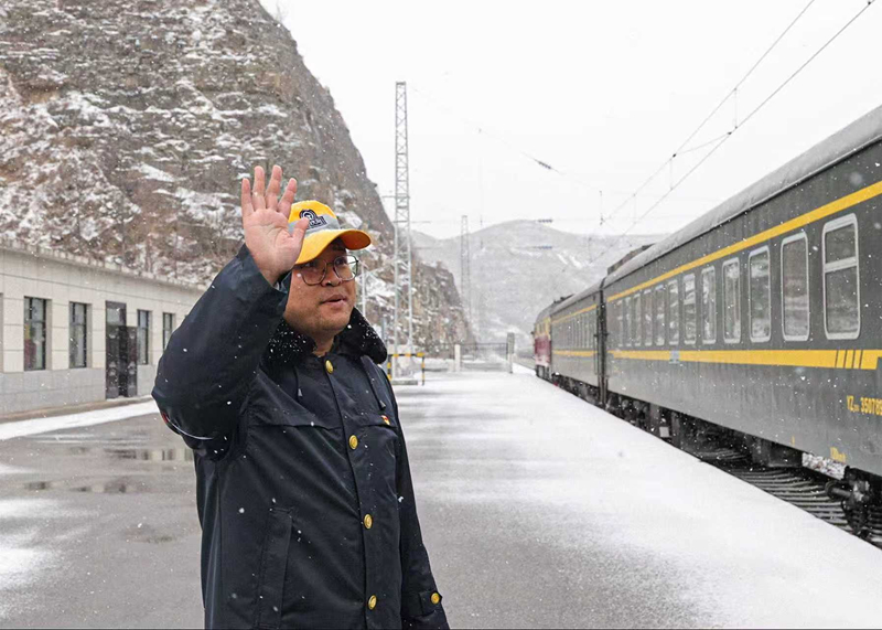 张家船站站长景宏斌在站台送别7005次慢火车。新华网发(王晓刚 摄)