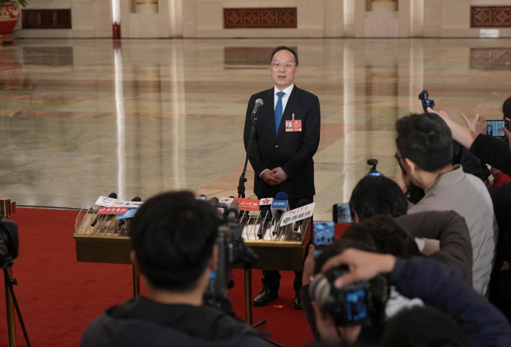 3月5日,第十四届全国人民代表大会第四次会议首场“部长通道”集中采访活动在北京人民大会堂举行。这是工业和信息化部部长李乐成接受媒体采访。新华社记者 王曦 摄