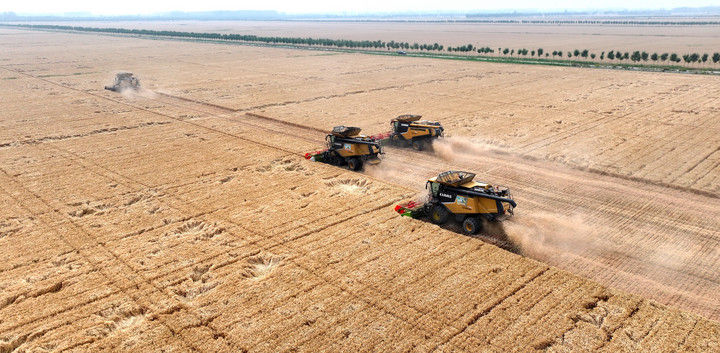 2025年5月27日,在驻马店市西平县老王坡高标准农田示范区,联合收割编队在田间有序穿梭。(图片由河南省委宣传部提供)
