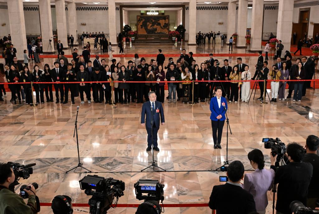 3月11日,全国政协十四届四次会议第三场“委员通道”集体采访活动在北京人民大会堂举行。这是全国政协委员徐坤(左)接受媒体采访。
