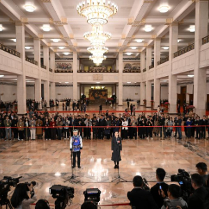 3月12日,第十四届全国人民代表大会第四次会议第三场“代表通道”集中采访活动在北京人民大会堂举行。这是记者在现场提问。