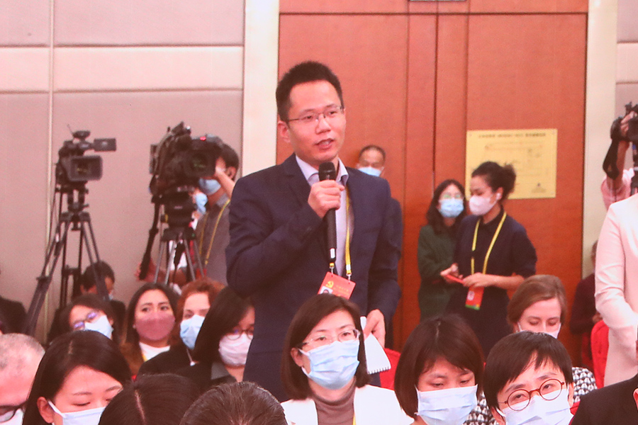 中國共產黨第二十次全國代表大會新聞發言人2022年10月15日(星期六)16時30分在人民大會堂舉行新聞發布會。圖為