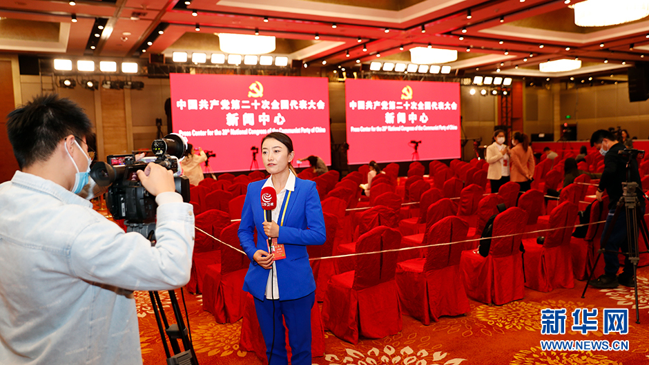 10月19日(星期三)19:30,二十大新聞中心將在梅地亞新聞中心二層新聞發布廳舉辦第四場集體采訪。圖為集體采訪前新世紀日航飯店三層世紀廳分會場。(新華網 陳杰 攝)