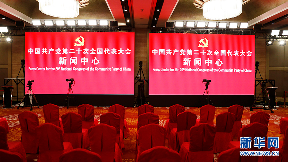 10月19日(星期三)19:30,二十大新聞中心將在梅地亞新聞中心二層新聞發布廳舉辦第四場集體采訪。圖為集體采訪前新世紀日航飯店三層世紀廳分會場。(新華網 陳杰 攝)