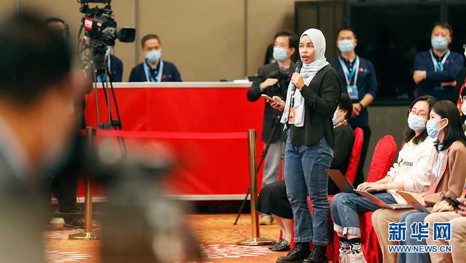 10月20日(星期四)19:30,二十大新聞中心在梅地亞新聞中心二層新聞發(fā)布廳舉辦第五場集體采訪。圖為馬來西亞國家通訊社記者在分會場提問。(新華網(wǎng) 陳杰 攝)
