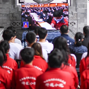 10月16日,在云南省大理白族自治州大理市白族傳統(tǒng)村落古生村,中國農(nóng)業(yè)大學、云南農(nóng)業(yè)大學等高校的老師、學生和村民在村中科技小院內(nèi)收看中國共產(chǎn)黨第二十次全國代表大會開幕會。新華社記者 江文耀 攝