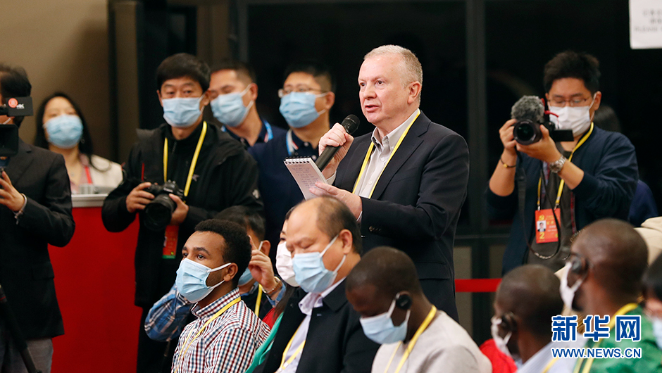 10月21日(星期五)10:00,二十大新聞中心舉辦第五場記者招待會。圖為彭博新聞社記者在分會場提問。(新華網 陳杰 攝)