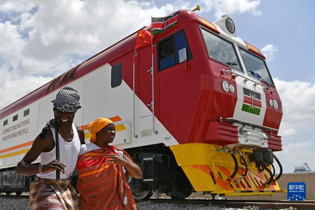 在肯尼亞蒙巴薩,當地民眾在中國承制的蒙內鐵路首批內燃機車旁載歌載舞(2017年1月11日攝)。新華社記者 孫瑞博 攝
