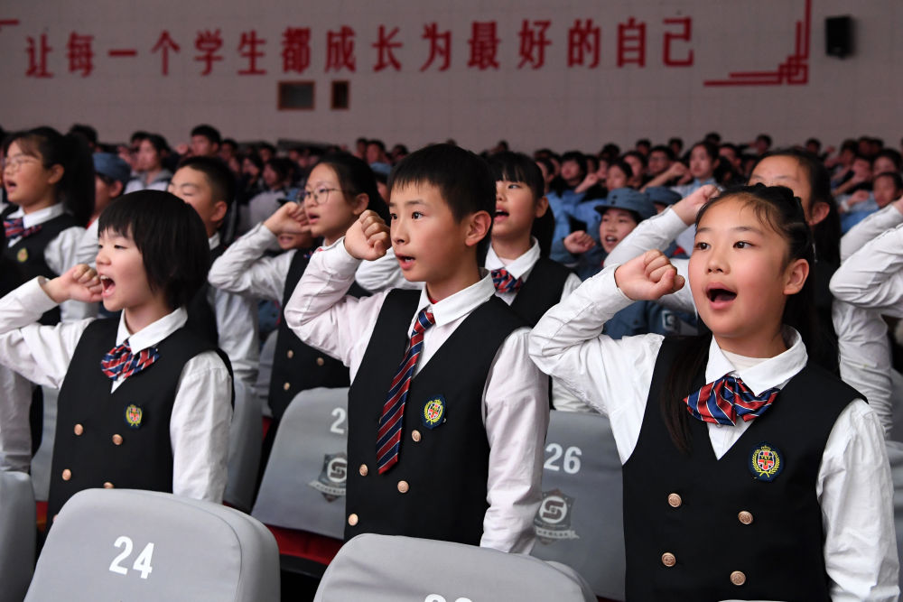 2024年11月13日,在“中流砥柱——中国共产党抗战文物展校园巡展”活动上,北京市第四中学顺义分校学生们共同宣誓,传承红色基因,接受爱国教育。该巡展把中国人民抗日战争纪念馆的馆藏资源搬进北京中小学校园,打造流动博物馆和红色思政课堂。