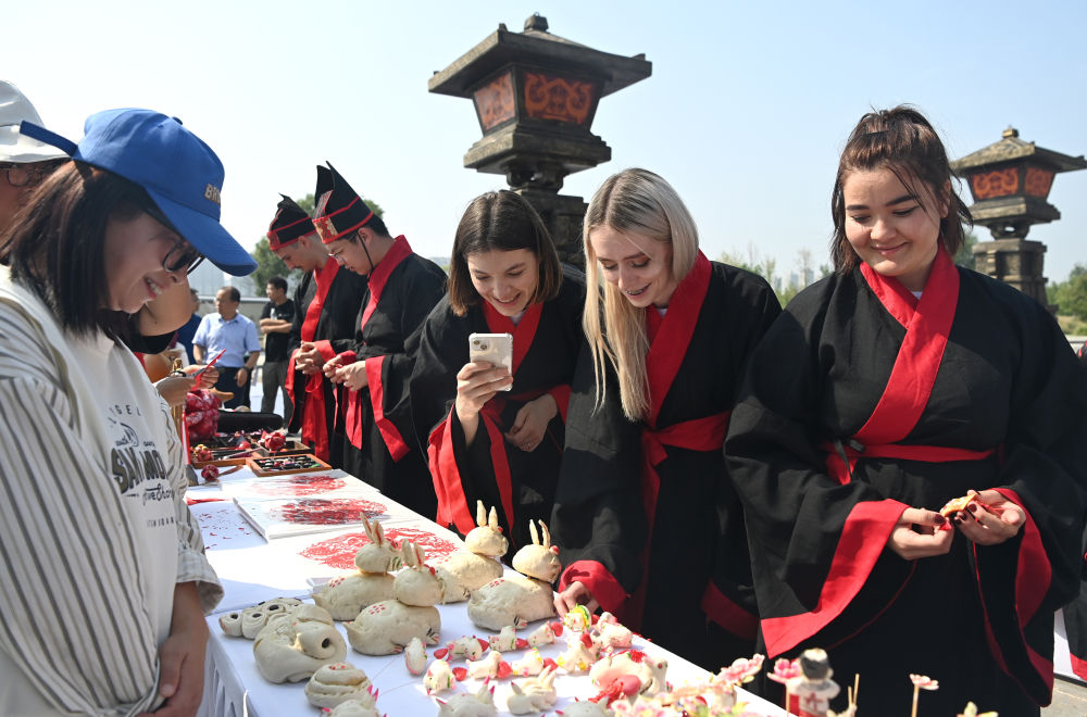2023年9月16日,“丝路起点 文明根脉”2023西安丝路留学生交流活动在西安启动,来自西安交通大学的百名中外大学生着汉服、行汉礼,通过沉浸式体验,了解中国传统文化。这是中外大学生在交流活动上了解陕西非遗。